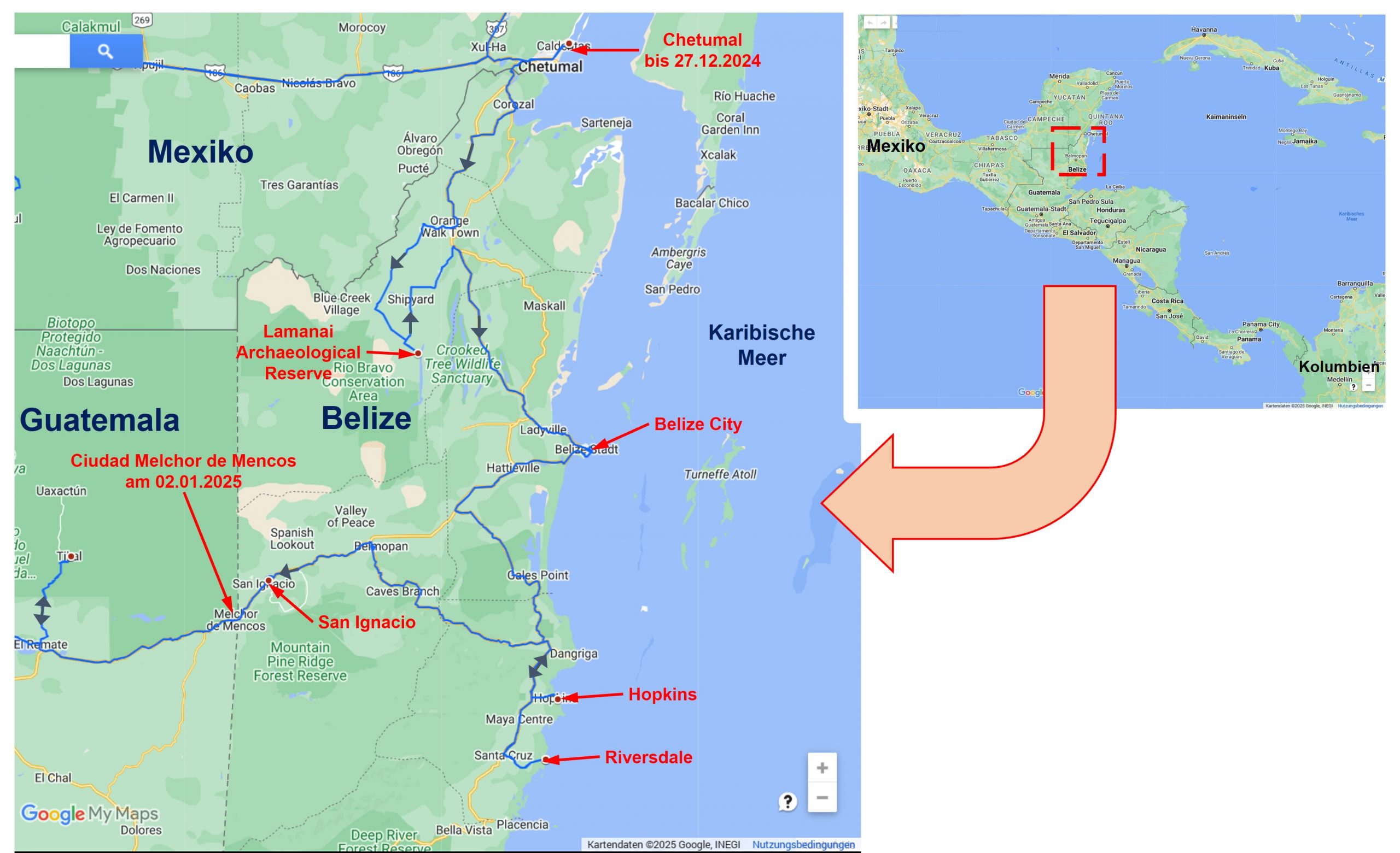 Wir reisten am 27.12.2024 ein. Die Grenzformalitäten zwischen Mexiko und Belize verliefen unkompliziert. Nachdem wir Weihnachten noch in Mexiko verbracht hatten, wollten wir über den Jahreswechsel ein paar Tage an einem schönen Strand der Karibikküste verbringen.